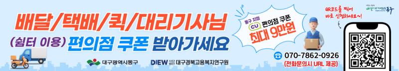 이동노동자 쉼터 이용 참여자 추가 모집 - 동구청, CU편의점 15곳을 쉼터로 지정 - 쉼터 이용을 원하는 배달·퀵라이더·택배·대리기사 추가모집