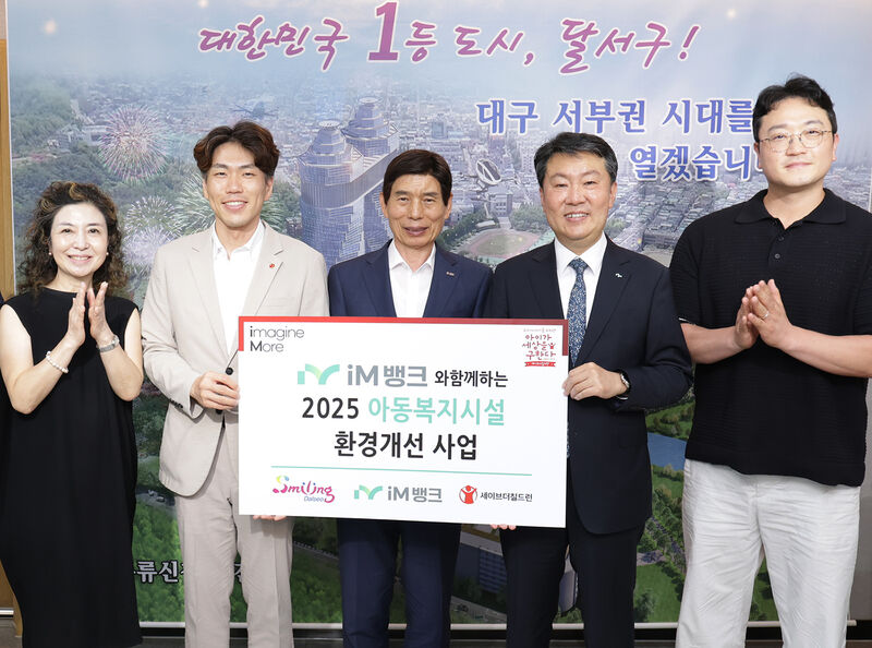 iM뱅크(아이엠뱅크, 은행장 황병우)는 7일(월) 오후 달서구청(구청장 이태훈)에서 달서구청, 세이브더칠드런코리아와 함께 ‘아동복지시설 주거환경 개선사업’ 후원금 전달식을 실시했다고 밝혔다.