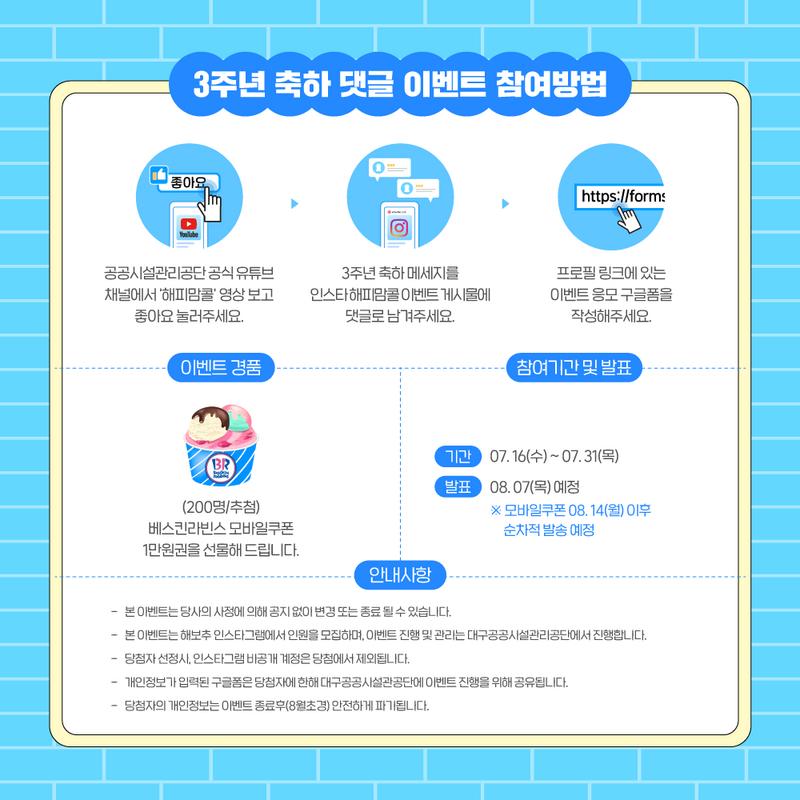 대구공공시설관리공단, 해피맘콜 3주년 특별 이벤트 실시 - 신규 회원 유입 및 서비스 이용 활성화 기대 - 공식 인스타그램 통해 시민 참여형 이벤트 진행, 추첨을 통해 모바일 기프티콘 증정