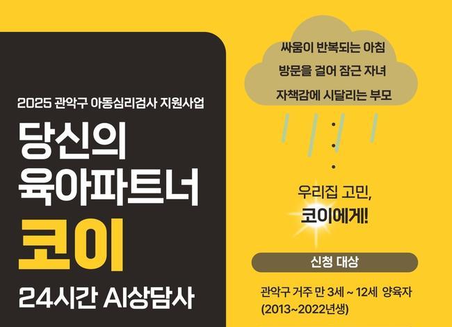 이 사업은 `2025년 관악구 아동그림심리검사 지원사업`의 일환으로 올해 처음 도입됐으며, 구는 인공지능 상담사가 간단한 대화만으로도 부모의 감정을 공감하고 조언을 제공해 부모들의 육아 고민을 쉽게 해소할 수 있을 것으로 기대하고 있다.
