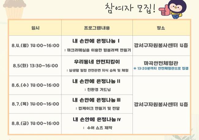 해당 프로그램은 8월 4일과 6일부터 8일까지 총 4일간 진행되며, 모든 활동은 오후 2시부터 4시까지 강서구자원봉사센터(공항대로 501) 4층에서 열린다.