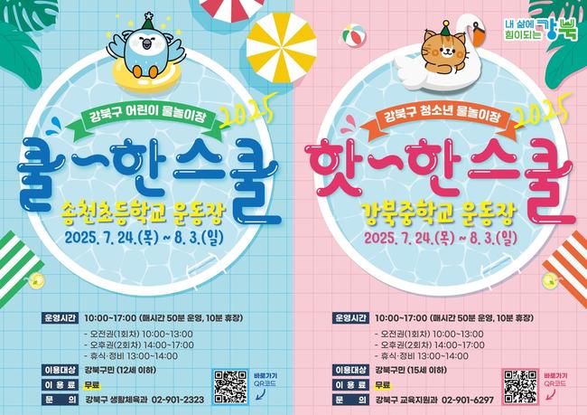 특히 올해는 지난해 물놀이장 이용 대상에서 제외됐던 청소년들도 함께 즐길 수 있는 `핫∼한 스쿨 청소년 물놀이장`을 새롭게 운영한다. 해당 시설은 강북중학교 운동장(한천로150길 67)에 조성되며, 관내 거주 15세 이하 아동·청소년이면 누구나 무료로 이용할 수 있다.