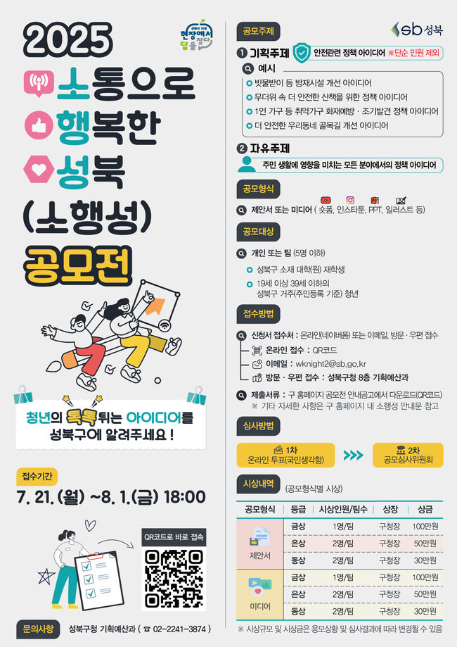 성북구가 청년의 시각에서 행정 사각지대를 메우고 참신한 정책 아이디어를 발굴하기 위해 ‘2025 소통으로 행복한 성북(소행성) 공모전’을 개최하고 참가자를 모집하고 있다.