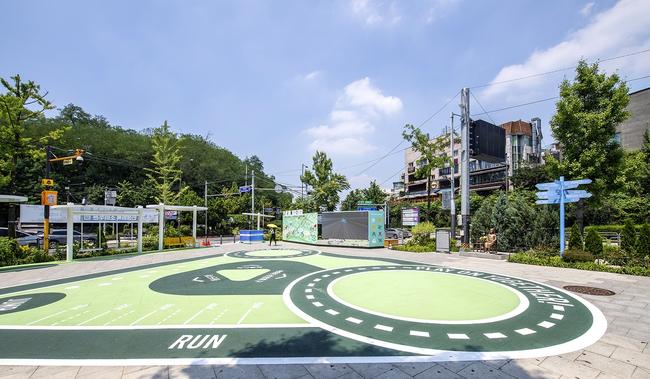 새롭게 단장한 녹사평광장은 경쾌한 녹색 계열로 바닥 포장한 미끄럼방지(MMA) 놀이공간과 곳곳에 설치한 곡선 형태의 그늘막 쉼터(파고라)가 첫 눈길을 끈다. 그래픽 아트로 그린 관광안내지도와 디지털 콘텐츠를 담은 미디어월도 공간에 활기를 불어넣는다.
