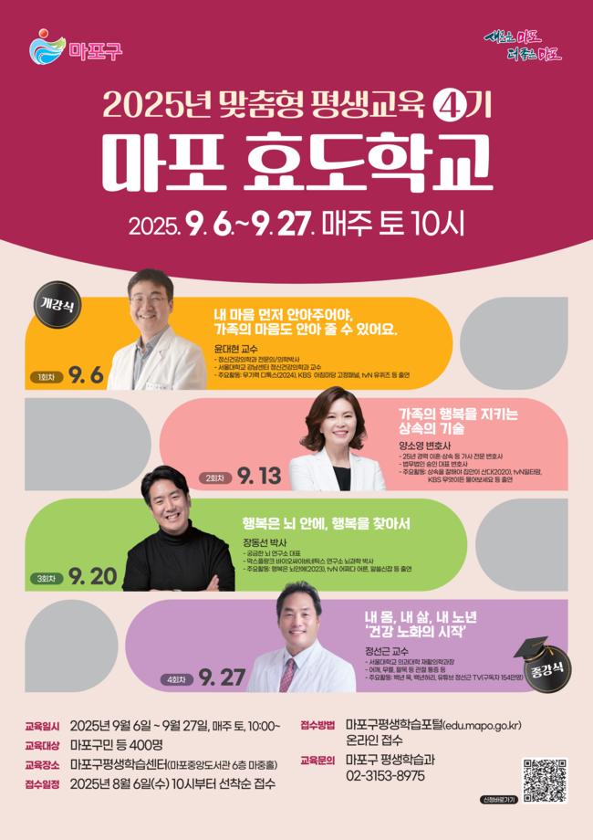 마포구가 ‘2025년 마포 효도학교 4기’ 수강생 400명을 선착순 모집한다.