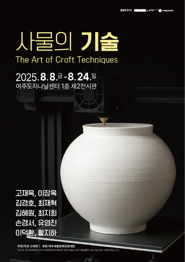 첫 번째 전시 ‘사물의 기술(The Art of Craft Techniques)’은 8월 8일부터 24일까지 여주도자나날센터에서 열린다. 고재욱 작가 기획으로, 3D 프린터·CNC 등 디지털 및 AI 기술을 활용한 공예품을 소개하며, ‘작가는 무엇을 하는 사람인가’라는 질문을 던진다. 고재욱, 김경호, 김혜원, 손경서, 이덕환, 이장욱, 최재혁, 최지희, 유영진, 황지하 등 10명의 작가가 기술과 예술의 경계를 탐구한 작품을 선보인다.