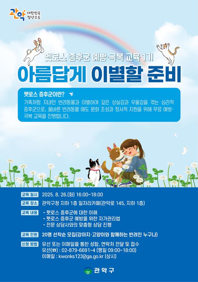 관악구(구청장 박준희)가 반려동물 상실로 인한 상실감과 우울감을 예방하고 극복하기 위해 8월 26일 ‘아름답게 이별할 준비’ 펫로스 증후군 교육을 실시한다.