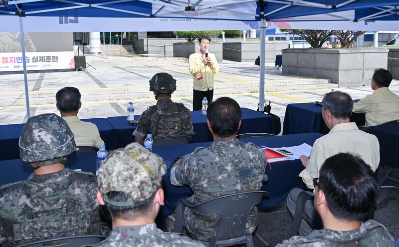 이번 실제 훈련은 오후 3시부터 1시간 정도 이뤄졌으며, 적 특작부대의 문화회관 침투 및 드론 공격으로 인한 시설물 파괴에 대응해 대피, 진압, 구조활동 등으로 구성된 민·관·군·경·소방 등 유관기관 합동훈련으로 진행됐다.