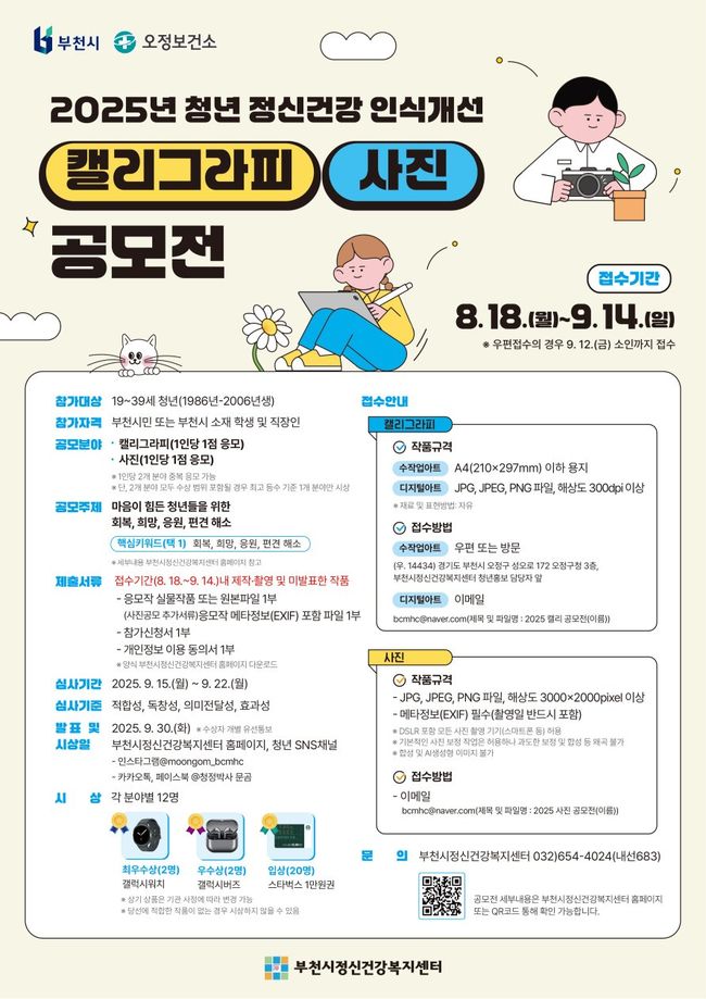 부천시가 청년 정신건강 인식 확산을 위해 ‘마음이 힘든 청년들을 위한 회복, 희망, 응원, 편견 해소’를 주제로 캘리그래피 및 사진 공모전을 개최한다.