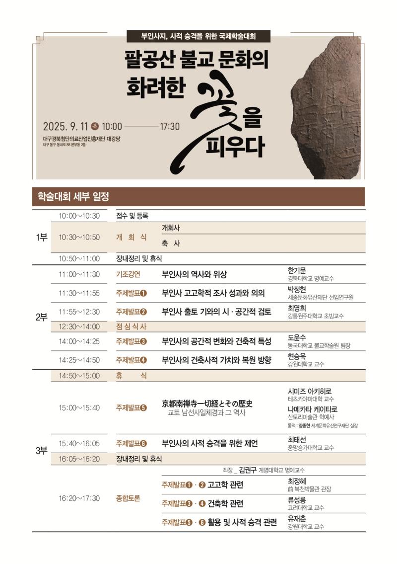 대구 동구청(구청장 윤석준)은 오는 11일, 대구경북첨단의료산업진흥재단 대강당에서 ‘팔공산 불교문화의 화려한 꽃을 피우다 – 부인사지 사적 승격을 위한 국제학술세미나’를 개최한다.