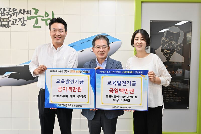 (사)군위군교육발전위원회 이사로 활동 중인 ㈜예스투어 우석용 대표와 부인인 군위보듬이나눔이어린이집 이유진 원장이 지난 3일 군위군청을 방문해 지역의 교육 발전과 인재양성을 위해 써달라며 각각 200만 원과 100만 원의 교육발전기금을 기탁했다.