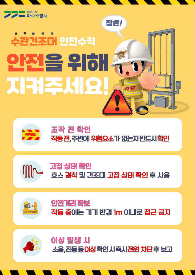 파주소방서는 9월 8일 소방대원의 안전사고 예방을 위해 전국 최초로 ‘소방호스 건조대 안전수칙’을 제작해 119안전센터에 배포했다.
