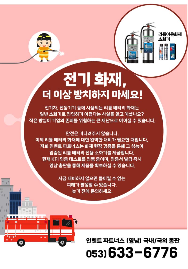 이제 리튬 배터리 화재에 대한 완벽한 대비가 필요한 때입니다. 저희 인벤트 파트너스는 화재 현장 검증을 통해 그 성능이 입증된 리튬 배터리 전용 소화기를 제공합니다. 현재 KFI 인증 테스트를 진행 중이며, 인증서 발급 즉시 영남 총판을 통해 제품을 확보하실 수 있습니다.