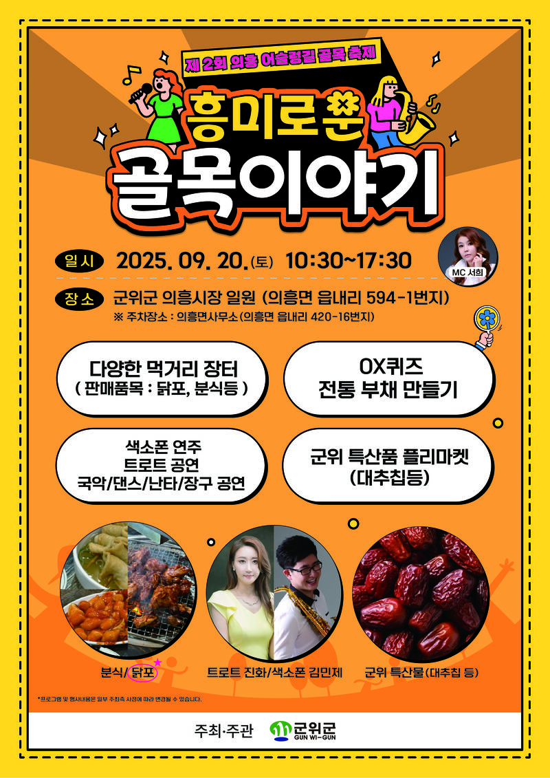 오는 9월 20일(토) 의흥면 의흥시장 일원에서 개최되는 ‘2025년 의흥 어슬렁길 골목축제’는 의흥(義興)만의 흥(興)겨움과 매력적인 맛(味)이 어우러진 축제로, ‘흥(興)미(味)로운 골목이야기’를 부제로 진행된다.