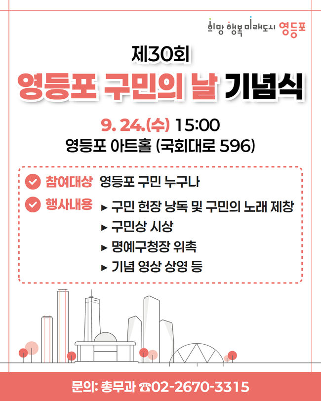 영등포구(구청장 최호권)는 ‘제30회 영등포 구민의 날’을 맞아 9월 15일부터 29일까지 구민이 함께 즐길 수 있는 다양한 기념행사와 특별 혜택을 마련했다.