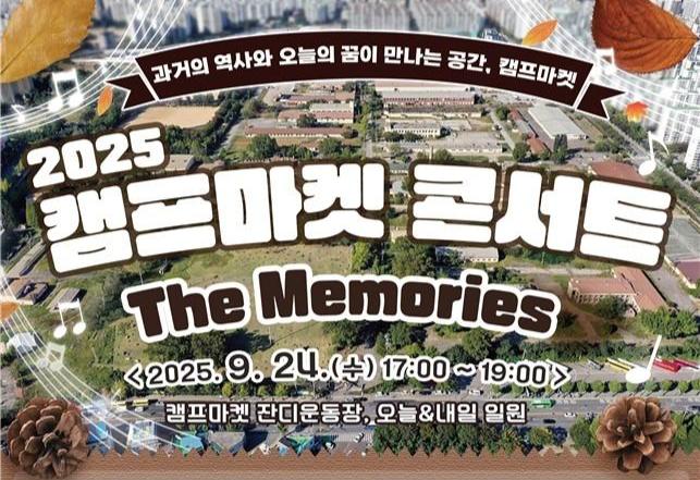 인천광역시(시장 유정복)는 오는 9월 24일 오후 5시, 부평 캠프마켓 개방 공간인 잔디운동장에서 `2025 캠프마켓 콘서트 The Memories`를 개최한다고 밝혔다.