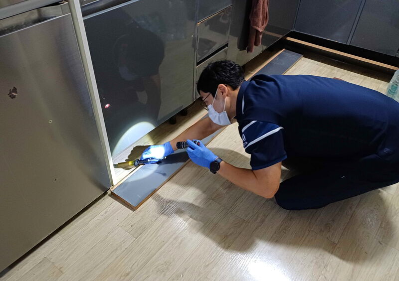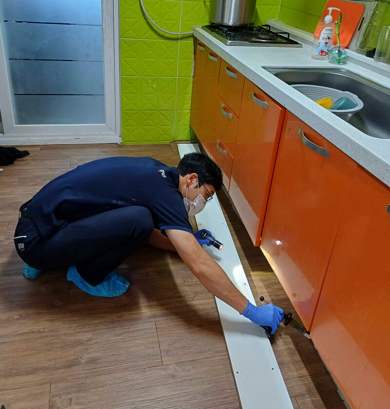 전문 방역업체 직원이 대상 가구 주방 하부장을 소독하고 있는 모습. 달성군 제공.
