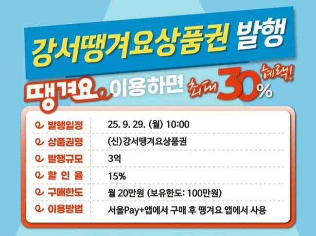 서울 강서구(구청장 진교훈)는 오는 29일 공공배달앱 `땡겨요`에서 사용가능한 상품권 총 3억 원을 발행한다.
