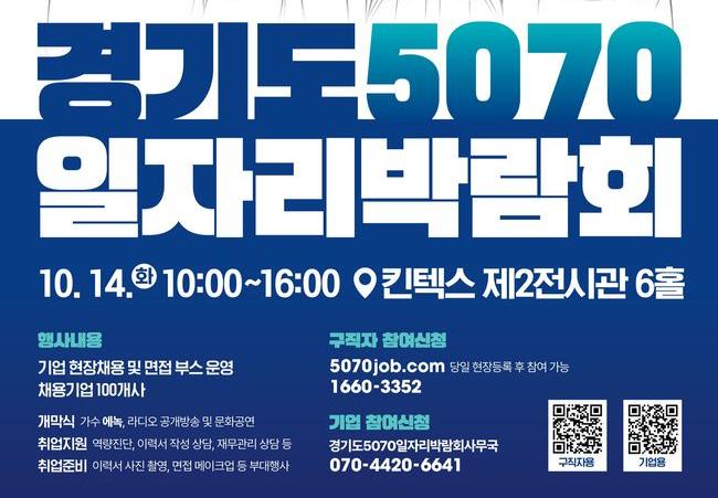 경기도, 5070세대 위한 일자리박람회 14일 킨텍스서 개최 - 100여 개 채용기업·3천여 명 구직자 참여… 실전 중심 원스톱 취업 지원