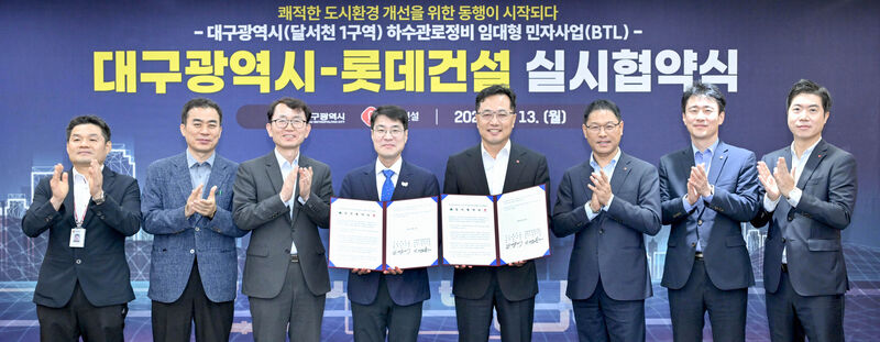 대구광역시는 금호강 르네상스 핵심사업인 ‘하수관로 우·오수 분류화 사업’의 신속한 추진을 위해, 10월 13일(월) 오후 2시 동인청사 2층 상황실에서 ‘달서천 1구역 하수관로정비 임대형 민간투자사업(BTL)’의 실시협약을 롯데건설과 체결했다.