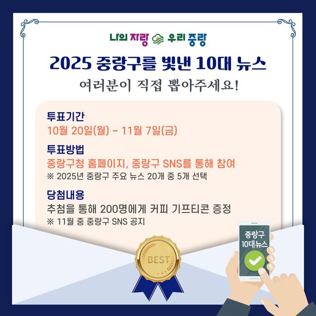 중랑의 2025년, 어떤 순간이 빛났나요 주민참여로 선정하는 10대 뉴스 투표 시작.중랑구(구청장 류경기)는 구민의 참여로 올해 구정 성과를 되돌아보고 자긍심을 높이기 위한 ‘2025 중랑구를 빛낸 10대 뉴스’ 온라인 주민 투표를 10월 20일부터 11월 7일까지 실시한다고 밝혔다.