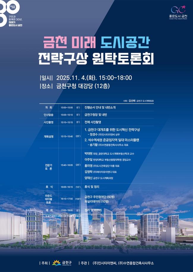 또한 각 분야 전문가들이 참여해 다양한 시각에서 금천의 미래를 논의한다. 분야별 전문가로는 ▲도시계획분야의 이주일 한양대 부동산융합대학원 교수 ▲도시경제분야의 홍미영 ㈜도시건축집단 대표이사 ▲도시경관분야의 김영학 에이치유이앤디 대표이사가 참여한다.