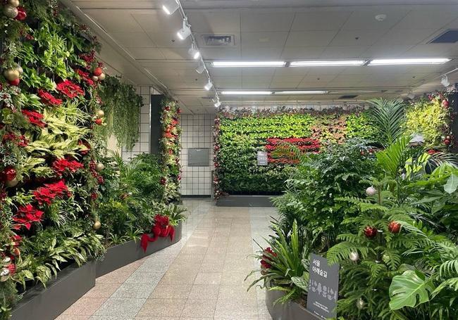 이번 크리스마스를 맞아 두 역사의 `서울 아래숲길` 전 구간을 금빛 장식 공과 벨벳 리본 등으로 꾸미고, 겨울을 상징하는 빨간 포인세티아 꽃을 곳곳에 배치했다.