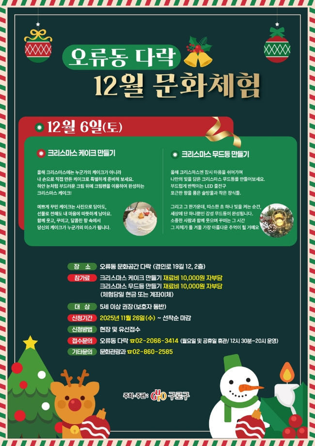 장인홍 구로구청장은 “연말을 맞아 주민들이 가까운 문화공간에서 따뜻하고 즐거운 시간을 보내길 바란다”며 “앞으로도 생활 속에서 문화와 휴식을 누릴 수 있도록 다양한 프로그램을 확대할 계획”이라고 말했다.