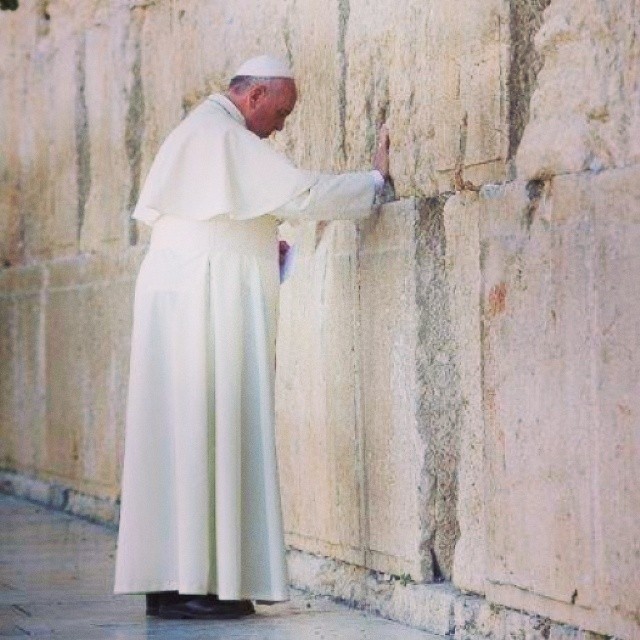이스라엘 예루살렘 서쪽 성벽(통곡의 벽)에서 기도하는 프란치스코 교황의 모습