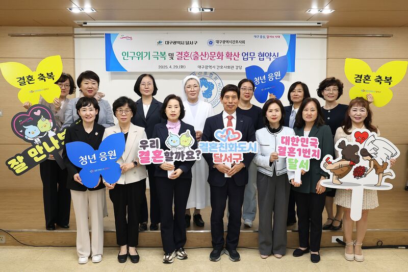 대구 달서구(구청장 이태훈)는 대구광역시간호사회(회장 서부덕)와 초저출생 인구위기 극복을 위해 공동 대응하고,‘잘 만나보세’뉴(NEW) 새마을운동(결혼문화) 확산 등을 위한 업무 협약을 체결했다고 6일 밝혔다.