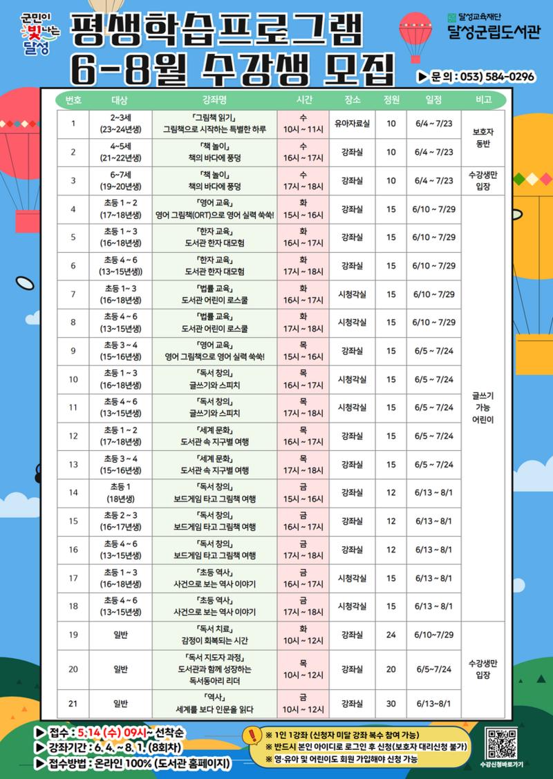 2025년 2분기 달성군립도서관 평생학습 프로그램 강좌 안내 포스터. 달성군 제공.