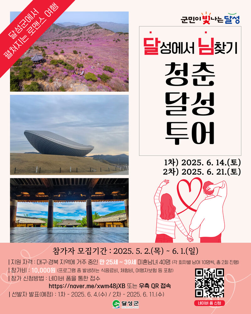 대구 달성군(군수 최재훈)이 6월 1일까지 미혼남녀를 대상으로 ‘달성에서 님찾기 청춘달성투어’ 참가자를 모집한다고 밝혔다.