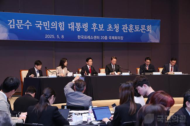 김문수 국민의힘 대통령 후보는 지난 8일 오전 서울 중구 한국프레스센터 국제회의장에서 열린 관훈클럽 초청 토론회에 참석하고 패널들의 질문에 답변하고 있다.