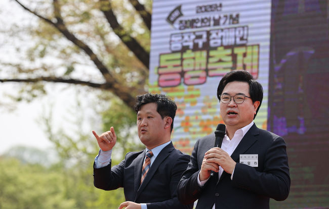 박일하 구청장이 지난달 제45회 장애인의 날 기념 `2025년 동작구 장애인 동행 축제`에서 인사말을 하고 있다.