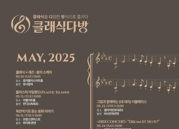 이번 `2025 클래식다방`은 5월과 9월 두 달간 총 20회에 걸쳐 운영되며, 처음으로 평일 공연도 도입해 화·목·토요일 오후 3시에 진행된다. 특히 기존의 저녁 공연을 오후 시간으로 조정해 관람객들이 따뜻한 햇살과 함께 여유로운 분위기 속에서 클래식을 즐길 수 있도록 구성했다.