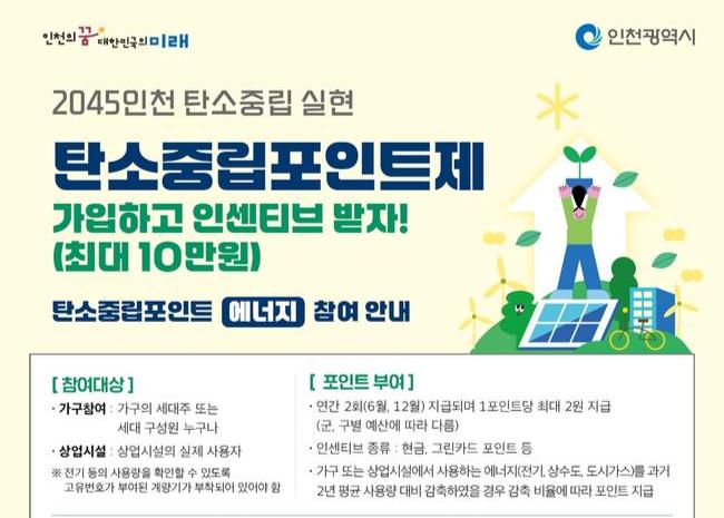 인천 동구(구청장 김찬진)는 탄소중립포인트제(에너지 분야) 참여자를 모집한다고 밝혔다.