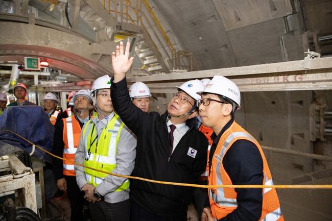 박상우 국토교통부 장관이 지난 4월 15일 오전 김포~파주 한강터널 건설현장을 방문해 공사 진행상황을 점검하고 현장 안전확보방안, 첨단기술을 활용한 안전관리 실태 등을 확인하고 있다.