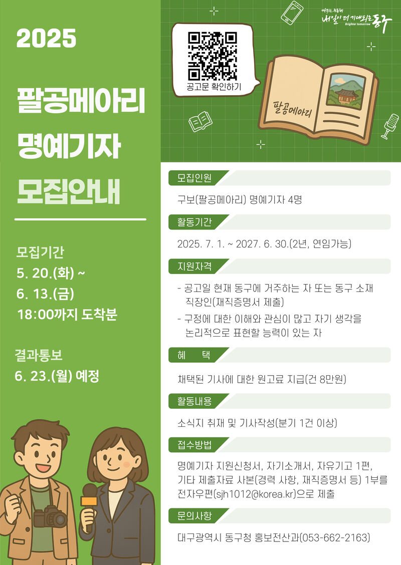 동구 대표 소식지 ‘팔공메아리’ 명예기자는 동구 구석구석 구민의 생생한 목소리를 소식지에 담는 역할을 한다. 총 4명을 모집하며, 오는 7월 1일부터 2년간 활동한다.