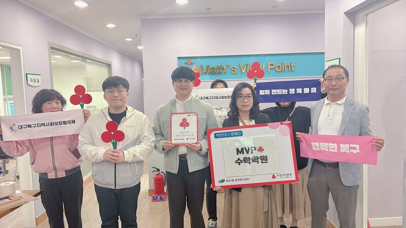 대구 북구 태전2동 ‘MVP수학학원(대표 조익제)’ 은 매전로 벚꽃거리에 있는 학원으로, 사회복지공동모금회 사업의 일환인 ‘착한학원’에 동참하고 협약하여 태전2동 지역사회보장협의체는 착한학원 현판을 전달하고 감사의 뜻을 전했다.