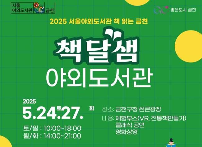 금천구(구청장 유성훈)는 24일부터 27일까지 4일간 금천구청 썬큰광장에서 야외도서관 `책달샘`을 운영한다고 밝혔다.