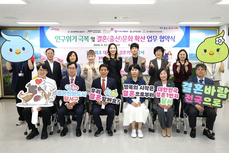 대구 달서구(구청장 이태훈)가 지난 22일 달서구청에서 국민연금공단 대구지역본부(본부장 장은경)를 비롯한 2개 공공기관 및 3개 민간단체와 함께 저출생 인구 위기 대응 및 결혼‧출산문화 확산을 위한 업무협약을 체결했다.