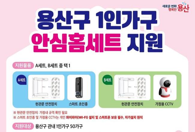 1인 가구의 경우 50가구를 선정해 현관문 안전장치를 필수적으로 지원하고, 스마트 초인종 또는 가정용 CCTV 중 하나를 선택해 설치할 수 있다. 지원 자격은 ▲용산구 거주 1인 가구 ▲전세보증금 3억 원 이하 ▲기존 안심장비 미지원 1인 가구 등 모든 요건을 충족해야 한다.
