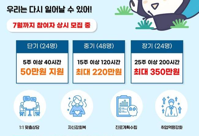 청년도전지원사업은 6개월 이상 구직단념 청년들을 대상으로 개인별 맞춤형 프로그램을 제공하고, 참여 기간 동안 청년들의 수당을 지급해 사회적 회복과 취업 활동을 돕는 사업이다.