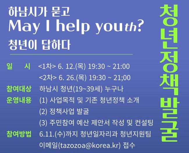 하남시(시장 이현재)가 청년의 시각에서 실효성 높은 정책을 발굴하기 위해 참여형 워크숍 `하남시가 묻고, 청년이 답하다 - May I Help Youth ?`를 운영한다.