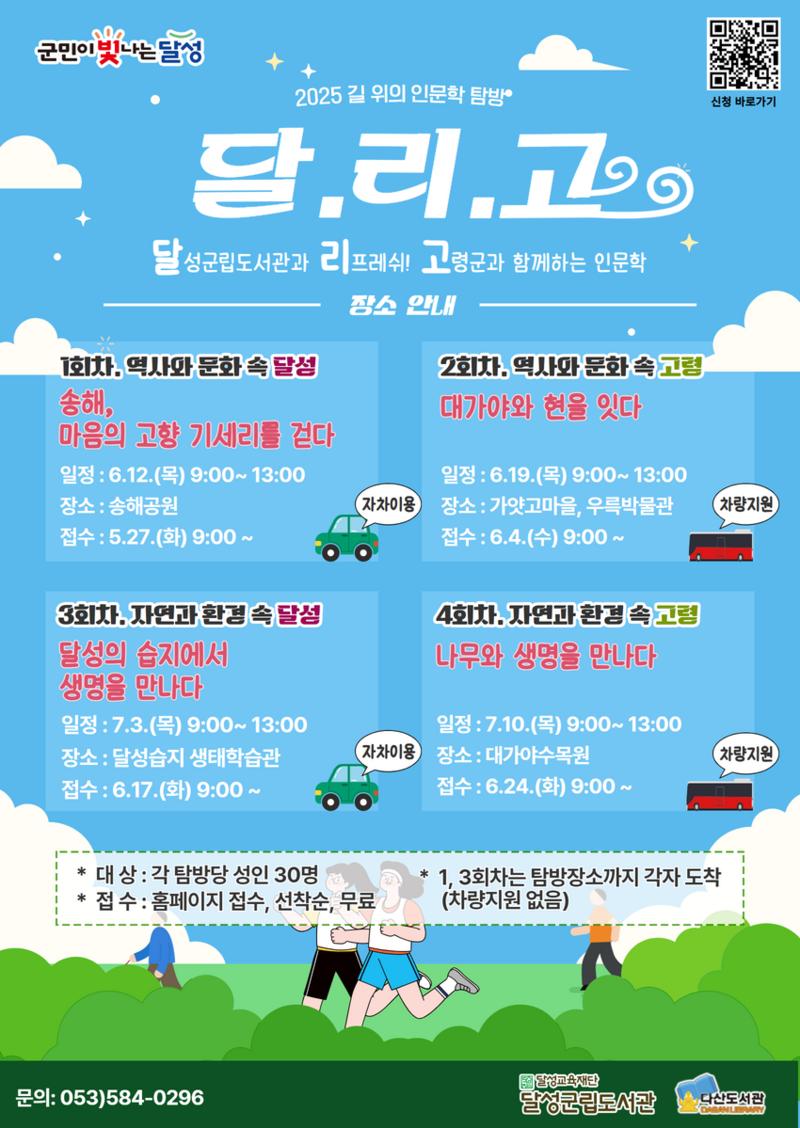달성군립도서관은 2025년 길 위의 인문학 탐방 ‘달.리.고(달성군립도서관과 리프레쉬! 고령군과 함께하는) 인문학’을 6월 12일부터 7월 10일까지 운영한다고 밝혔다.