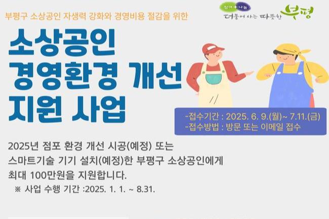 부평구(구청장 차준택)는 오는 9일부터 30일까지 `2025년 소상공인 경영환경 개선 지원사업` 참여업체를 선착순 모집한다.
