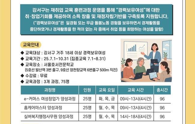 교육 대상은 강서구에 거주하는 18세 이상 경력 보유 여성 중 취업 또는 창업을 희망하는 사람이며, 수강료는 전액 무료다. 다만, 자격증 취득을 위한 수수료 등 일부 비용은 본인 부담이다.