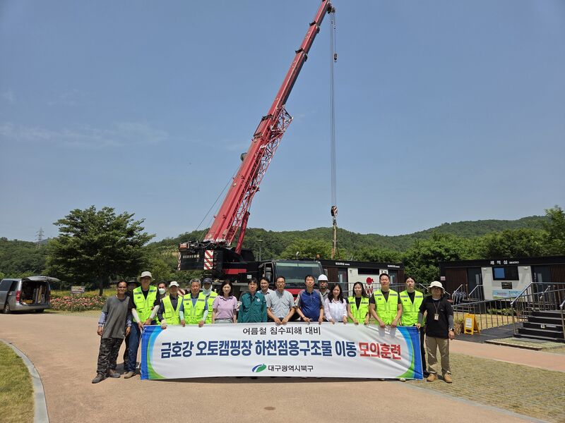 대구 북구청(청장 배광식)은 6월 10일 오전, 금호강 오토캠핑장에서 여름철 집중호우로 인한 침수피해 예방을 위한 구조물 이동 모의훈련을 실시하였다고 밝혔다.