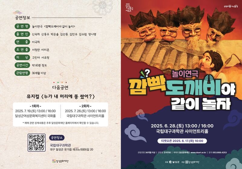 (재)달성문화재단(이사장 최재훈)은 ‘2025 달성 아동극 시리즈’의 두 번째 공연으로 ‘깜빡도깨비야 같이 놀자’를 오는 28일 국립대구과학관 사이언트리홀에서 오후 1시와 4시에 각각 개최한다고 밝혔다.