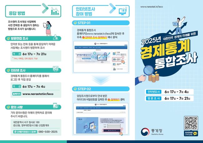 통계청은 6월 17일부터 7월 21일까지 전국 약 36만 개 사업체를 대상으로 ‘2025년 경제통계 통합조사’를 실시한다고 17일 밝혔다.